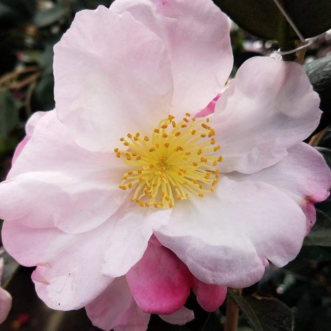 Apple Blossom Camellia offers a graceful display of soft beauty. Pink-tinted buds open to semi-double white blooms, sometimes lightly flushed with pink, creating a romantic, apple-blossom effect. Its flowering season stretches from late winter into early spring, providing welcome color when few plants are in bloom.