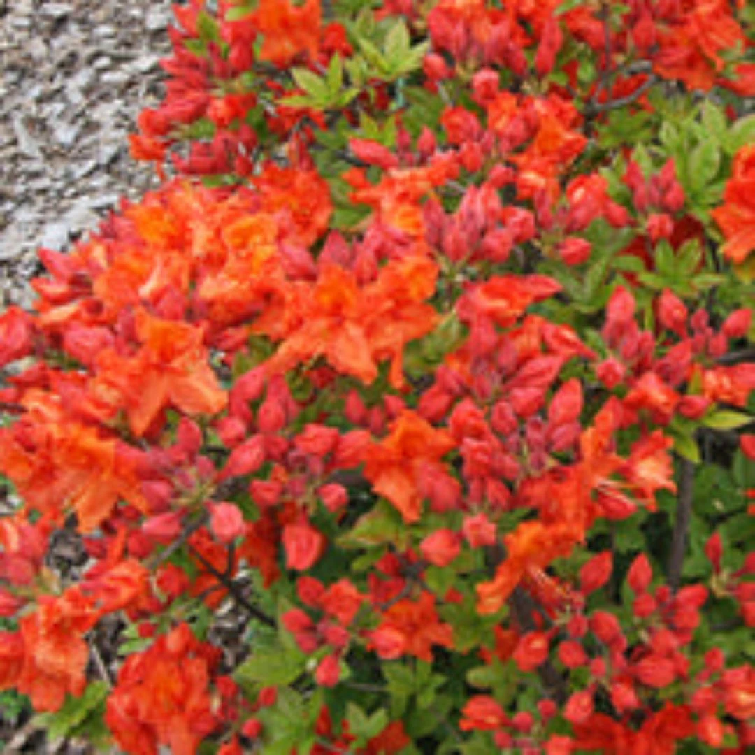 ‘Gibraltar’ is a stunning deciduous azalea that adds blazing color to spring landscapes. Its large, vivid orange-red flowers bloom in clusters before the foliage fully emerges, creating an unforgettable display.
