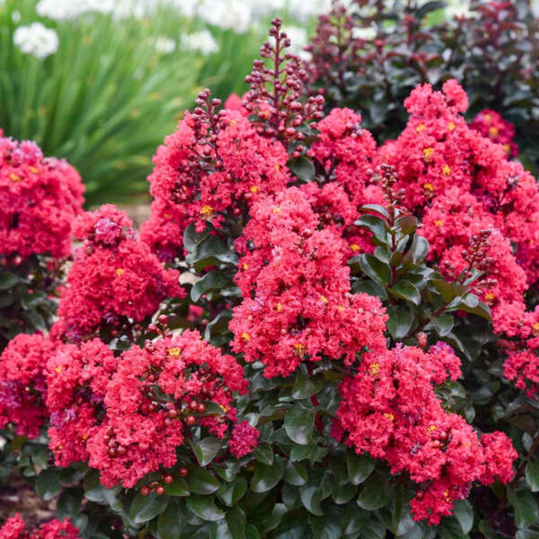 LAGERSTROEMIA ‘CHERRY MOCHA’ PP28281 – A compact dwarf crapemyrtle known for its bold contrast of dark burgundy-black foliage and cherry-red blooms. This long-flowering shrub adds striking color to landscapes from summer through fall. Great for containers, borders, or small garden spaces.